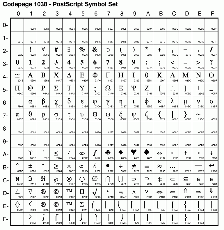 | MacSymbol | MacSymbol | Apple PostScript Symbol | Adobe-Symbol-Encoding ibm-1038 | |