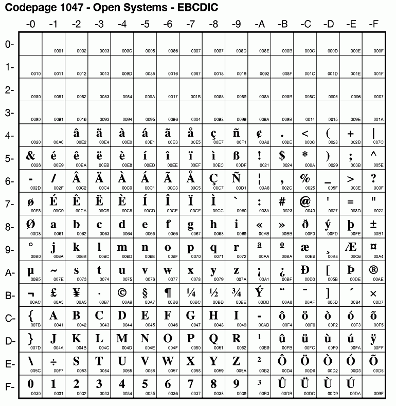 | Cp1047 | IBM-1047 | EBCDIC Open Edition | ibm1047 | ibm 1.2 |