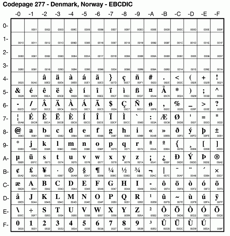 | Cp277 | IBM-277 | EBCDIC Denmark, Norway | ibm277 | |