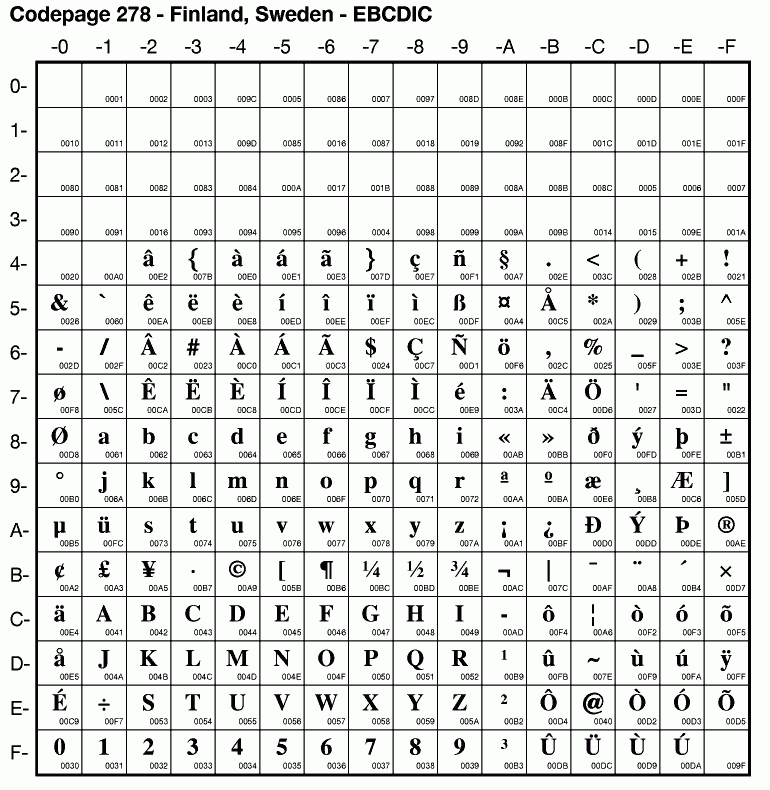 | Cp278 | IBM-278 | EBCDIC Finland, Sweden | ibm278 | |