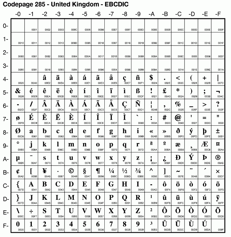 | Cp285 | IBM-285 | EBCDIC UK, Ireland | ibm285 | |