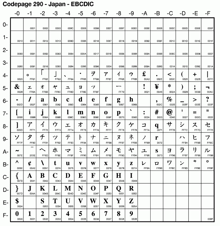 | Cp290 | IBM-290 | EBCDIC SBCS Japan Katakana | ibm290 | ibm 1.3 |