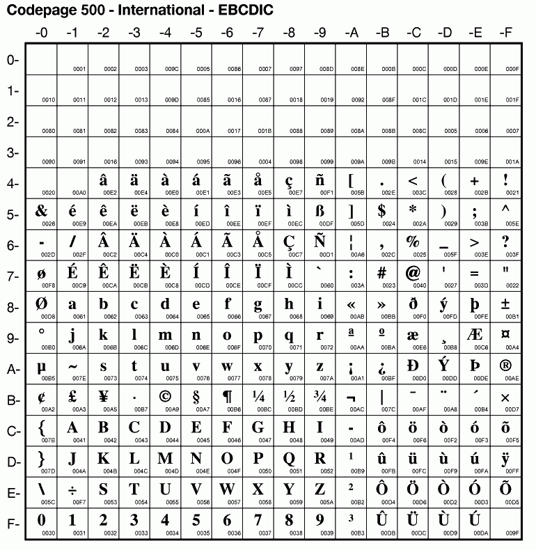 | Cp500 | IBM-500 | EBCDIC Latin 1 | ibm500 | |