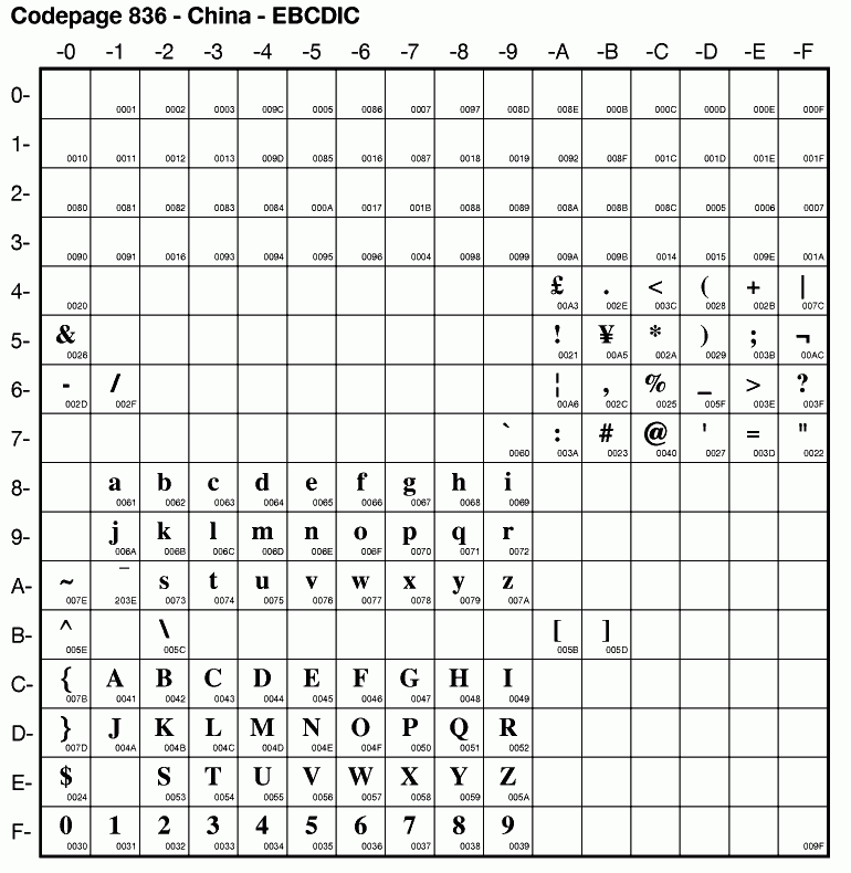 | Cp836 | IBM-836 | EBCDIC SBCS China | ibm836 | ibm 1.3 |