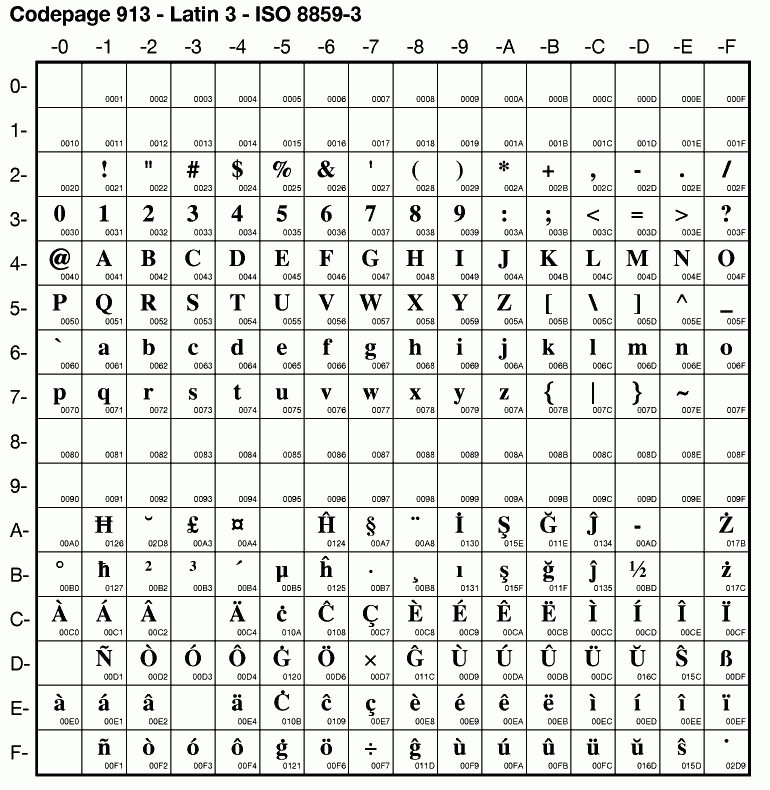 | ISO8859_3 | ISO-8859-3 | ISO Latin 3 (Latin, Esperanto) | 8859-3 Cp913 csisolatin3 ibm-913 iso8859_3 iso8859-3 iso-8859-3:1988 iso-ir-109 l3 latin3 | |