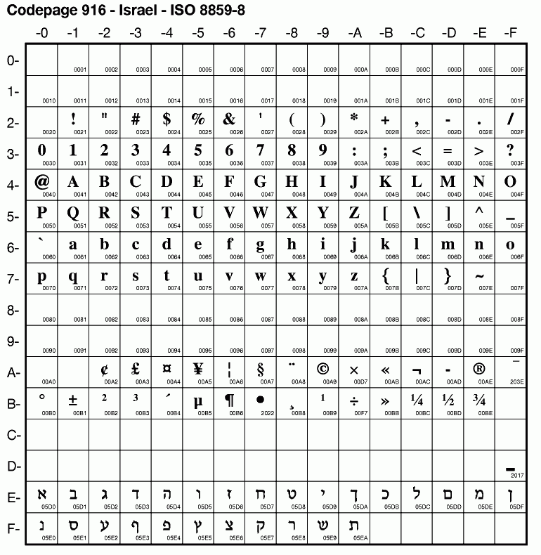 | ISO8859_8 | ISO-8859-8 | ISO Hebrew | 8859-8 Cp916 csisolatinhebrew hebrew ibm916 ibm-916 iso8859_8 iso8859-8 iso-8859-8:1988 iso-ir-138 | |